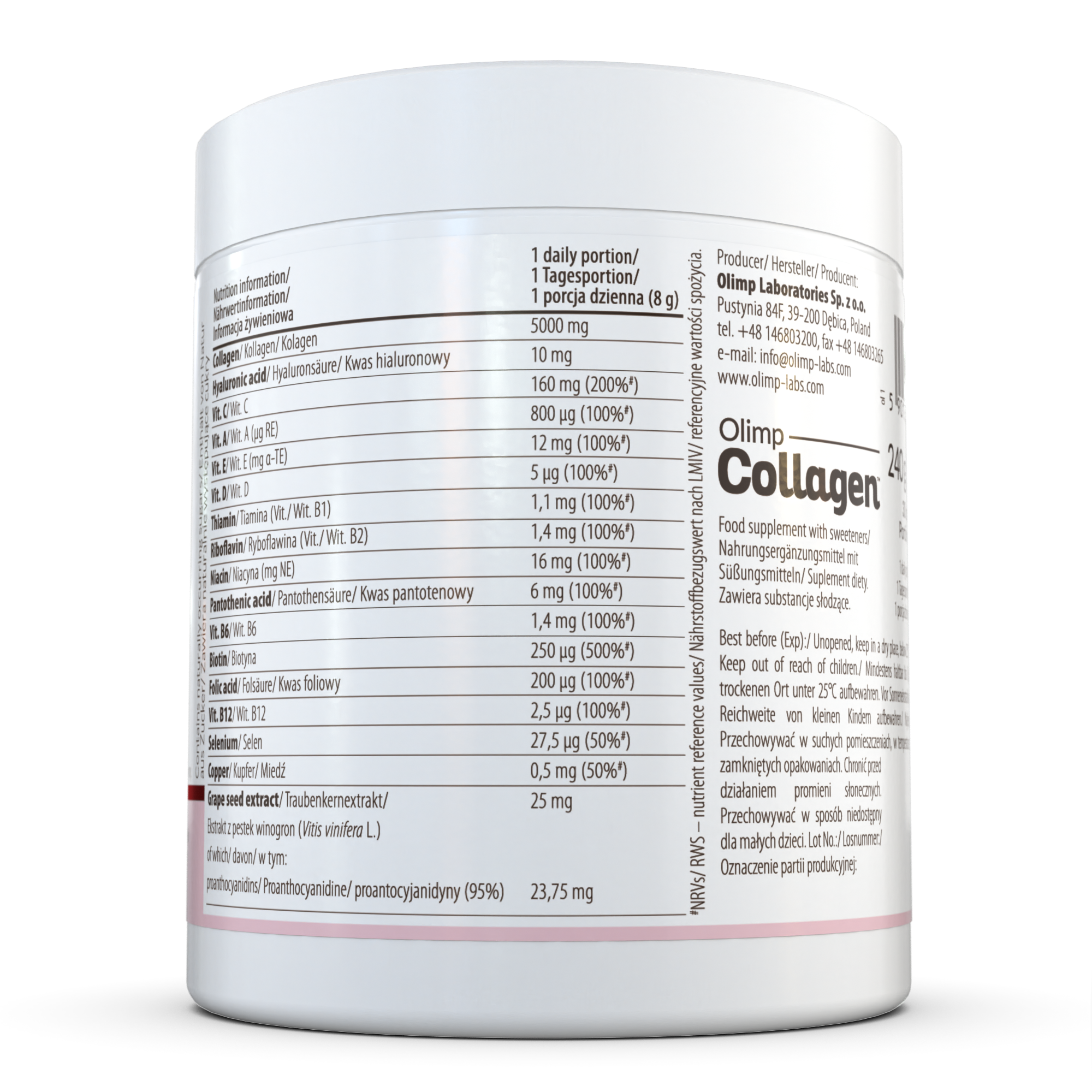 - 5 g augstas kvalitātes zivju kolagēna peptīdu katrā porcijā